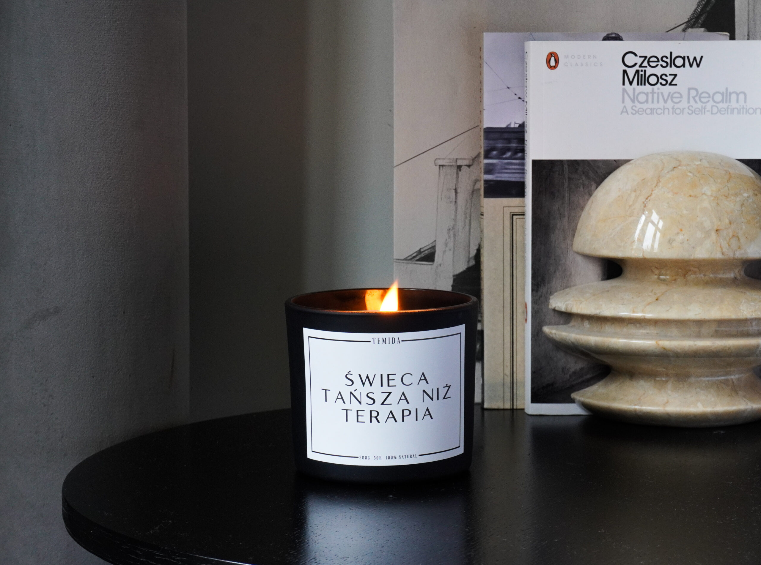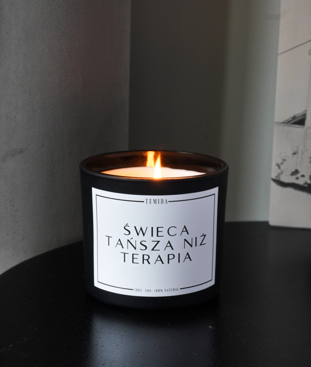 Sojowa świeca zapachowa “Świeca tańsza niż terapia”.